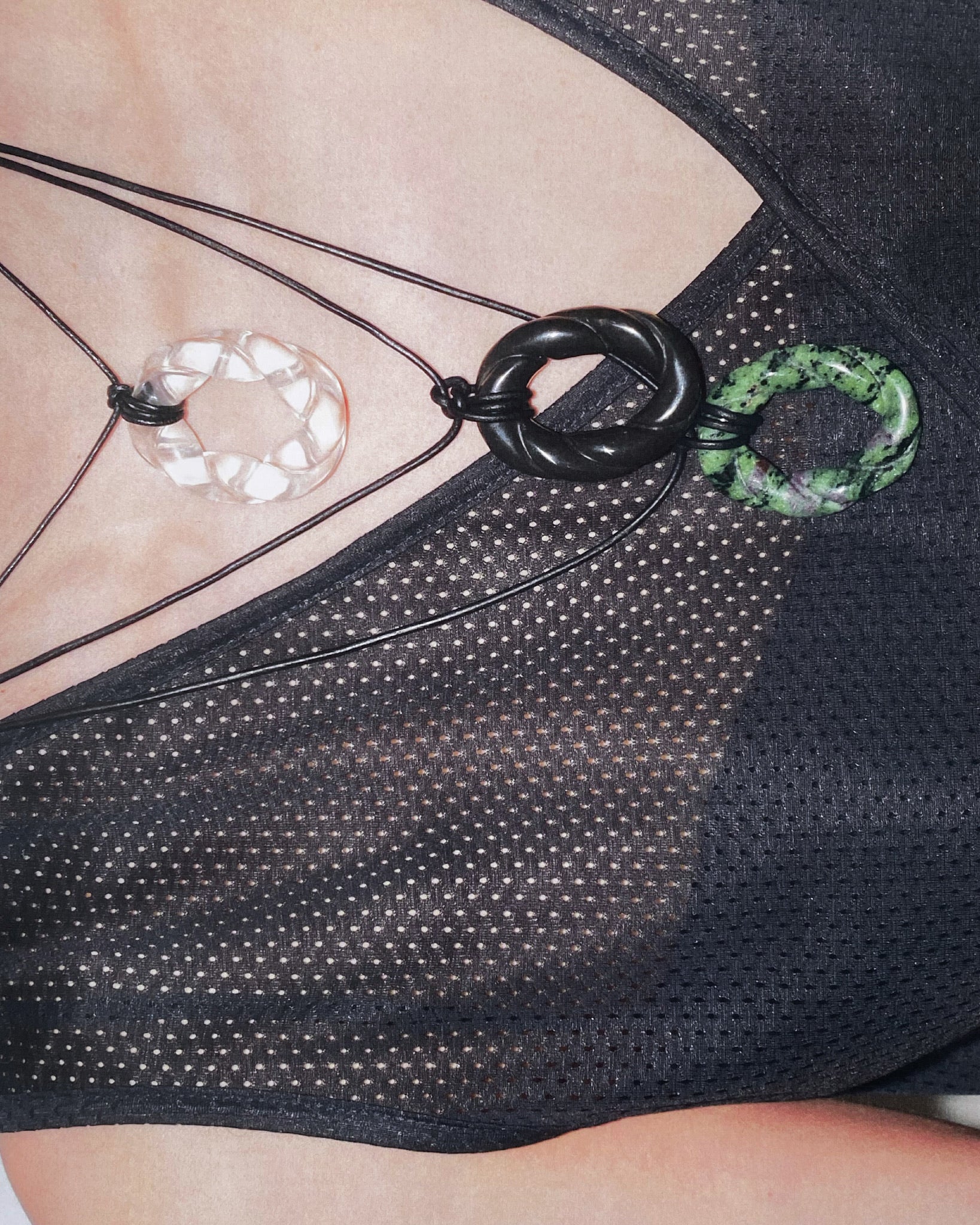TO ENSURE LONGEVITY, AVOID CONTACT WITH PERFUMES, CREAMS, AND CHLORINE WHILE WEARING. IF NECESSARY, RINSE WITH FRESH WATER AND LAY FLAT TO DRY, OUT OF DIRECT SUNLIGHT AND EXTREME HEAT.
